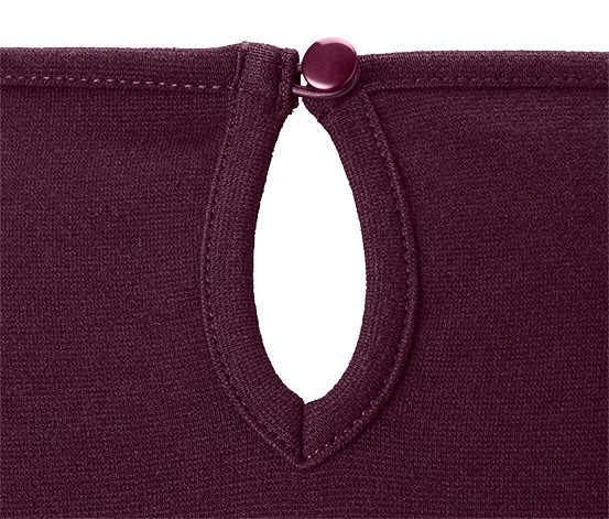 Сукня джерсі з пишними рукавами має круглий виріз на шиї у формі краплі, застебнутий на гудзик ззаду, і модні рукава 3/4.